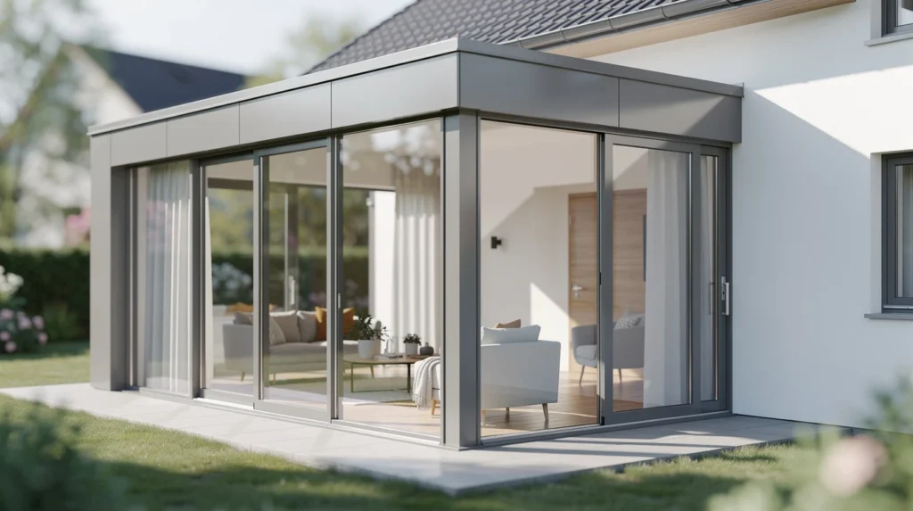 Les extensions en aluminium modernes intègrent des systèmes d’isolation avancés : double ou triple vitrage, ossature à rupture de pont thermique, et panneaux isolants dans la toiture et les murs. Par conséquent, la température intérieure reste agréable toute l’année, été comme hiver. Par ailleurs, l’isolation phonique permet de préserver la tranquillité des lieux, même en cas de proximité avec une rue passante ou un environnement bruyant.